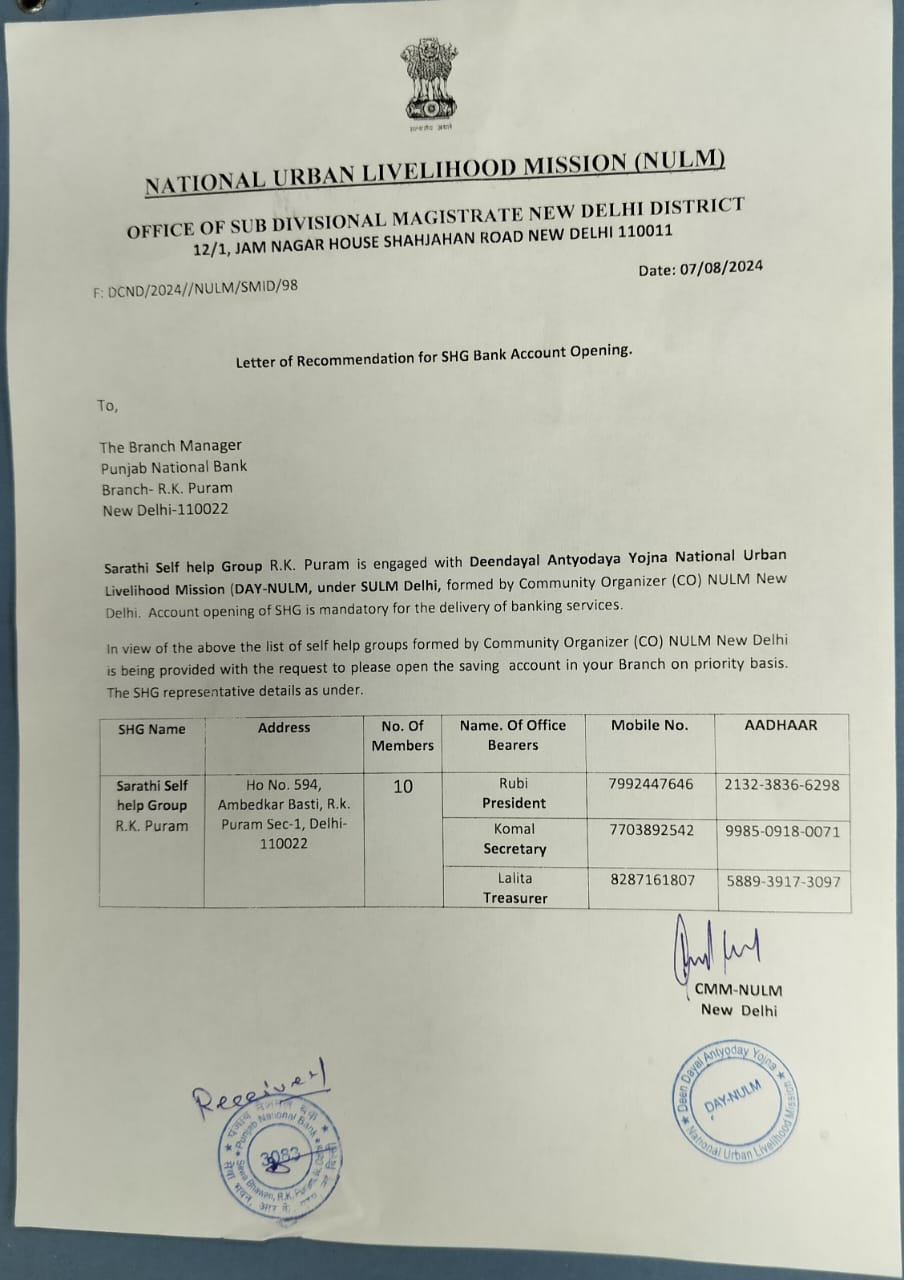 Letter recived from NULM for bank account opening.